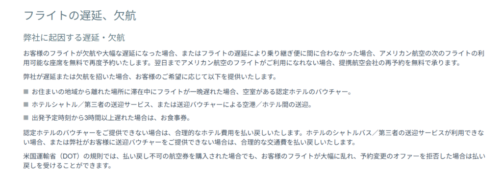 まず確認したのは、アメリカン航空の公式サイトに掲載されている補償ポリシーです。